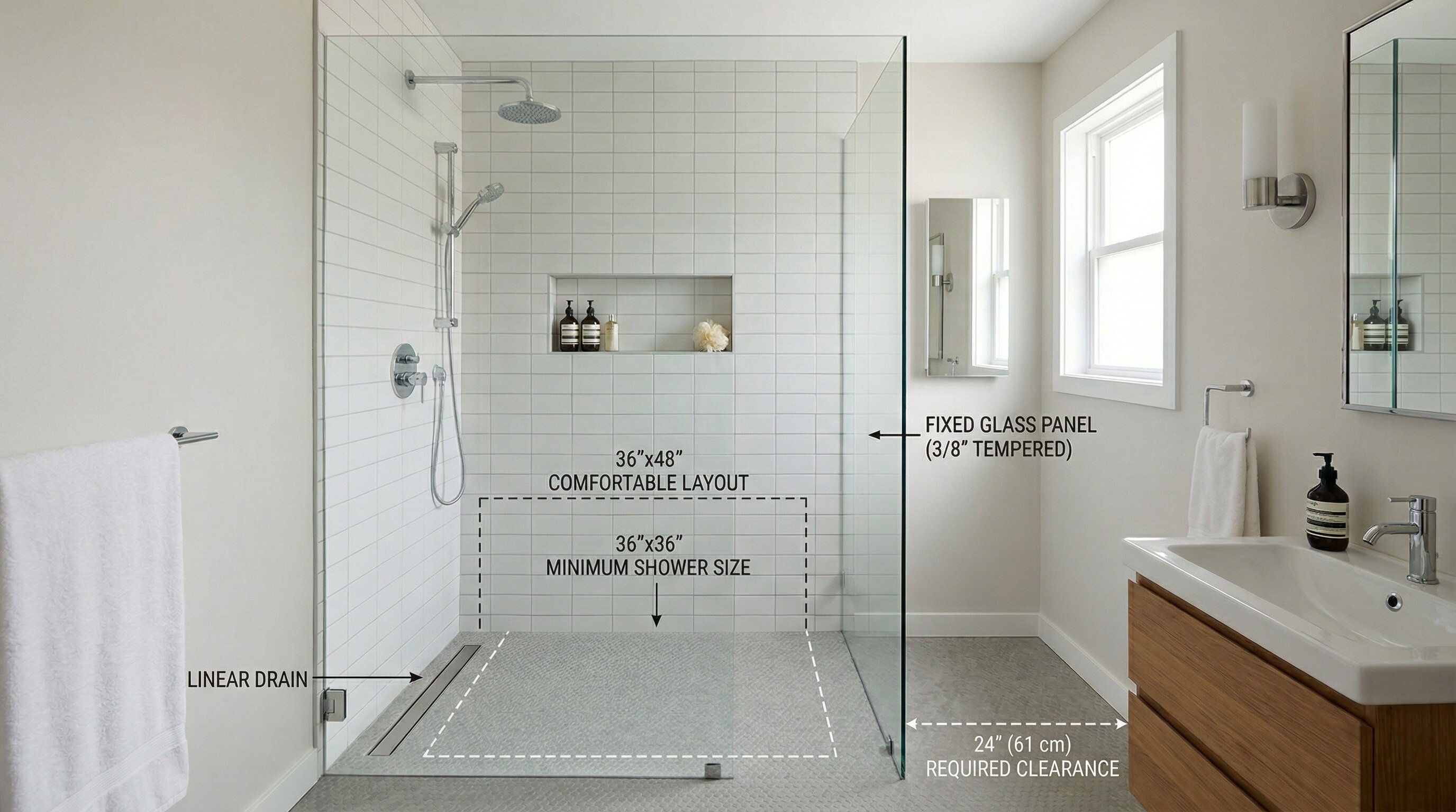 36×36 inches is the International Building Code minimum floor area for a walk-in shower. It is functional but tight. It works best for doorless or curbless designs where the absence of a door swing compensates for the limited floor area.